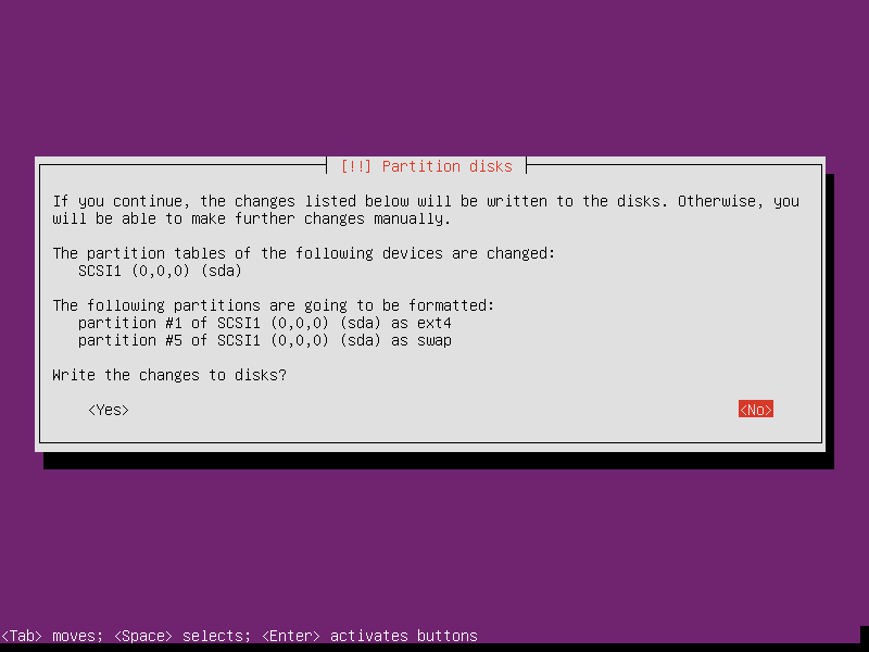 >> At the partition disks section, you have 'No' highlighted [1]. This will